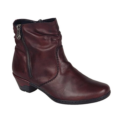 These women's Boots from Rieker consist of a simple and bold design that looks beautiful and sleek. The ideal boot for Autumn/Winter, the rich burgundy supple red leather upper features ruched detail that gives these boots some added style! The small 1.3 inch heel adds some extra lift with a faux zip detail on the outer to match the real zip fastening on the inside shoe. Team these fabulous Rieker boots with some jeans, leggins or a floaty skirt, for a casual chic look.
