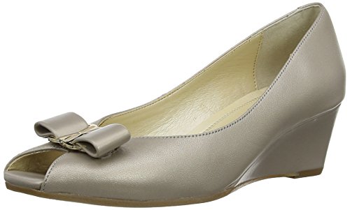 The Van Dal Bay court shoes are a wedge heel pair with a peep toe. A bow detail sits above the opening, attached to a glistening metal trim. Available in black patent, pearlised almond or marine navy, these slip on shoes stand on a slim rubber sole.